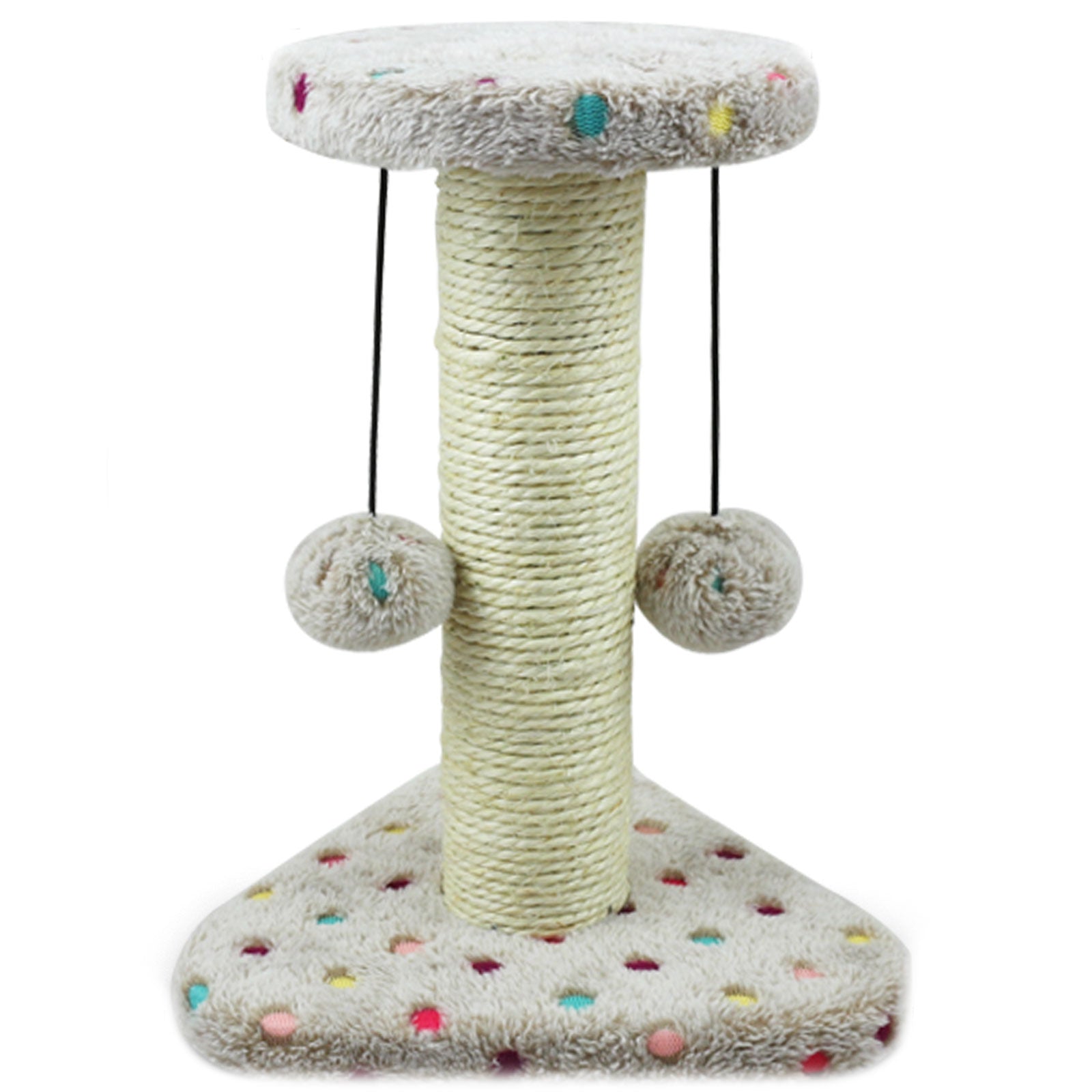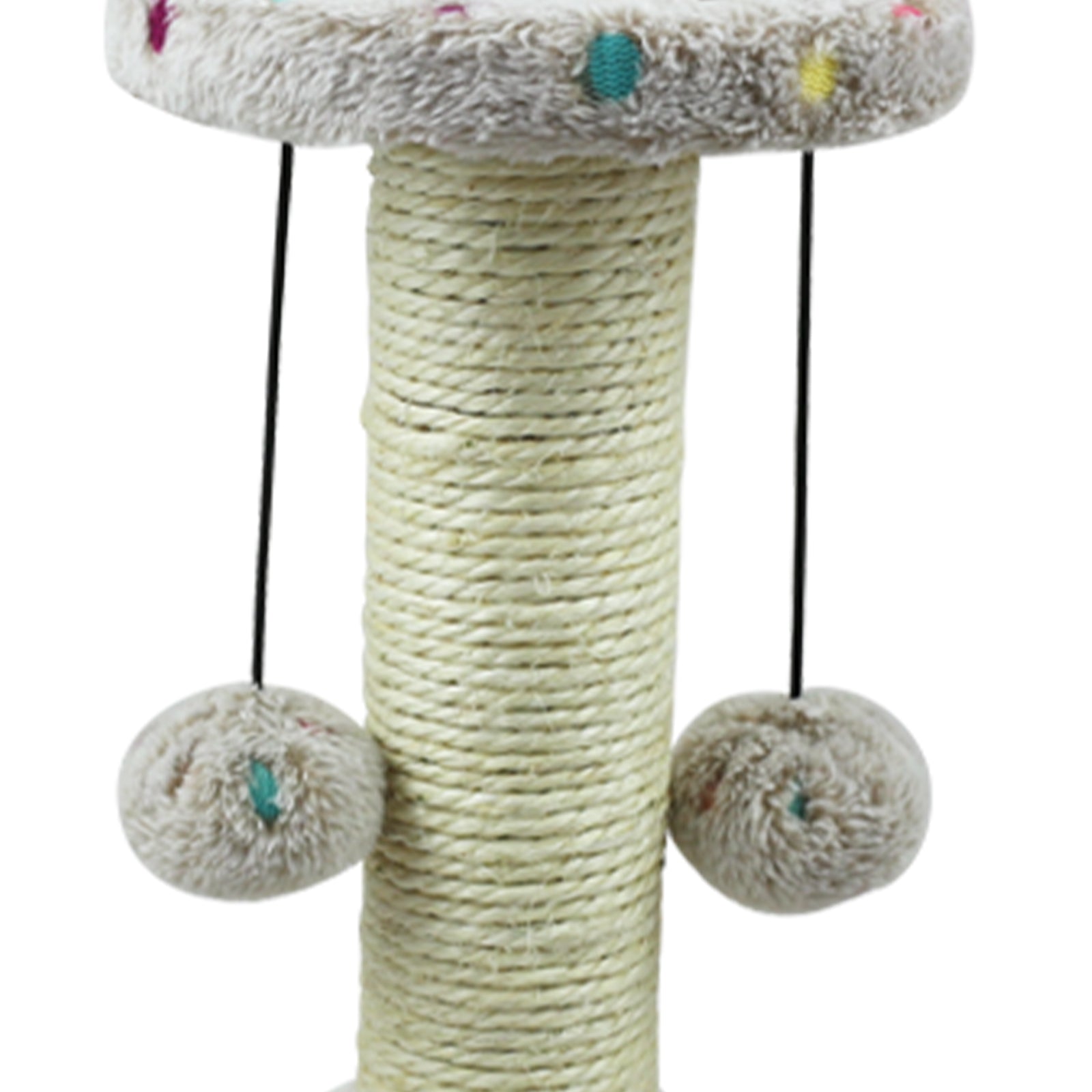 Luxuriöser Kratzbaum mit Plüsch-Bodenplatte und Sisal-Stamm – der perfekte Mix aus Funktionalität und Design. Die stabile Bodenplatte mit weichem Plüschbezug in Beige mit bunten Punkten sorgt für sicheren Halt und ein wohnliches Ambiente. Der mit Sisal ummantelte Kratzstamm bietet ideale Krallpflege, während die gepolsterte Liegefläche zum Ausruhen einlädt. Zwei interaktive Plüschkugeln fördern den Spieltrieb Ihrer Katze. Einfache Montage und ein stilvolles Design machen diesen Kratzbaum zum dekorativen Highlight für jedes Zuhause.
