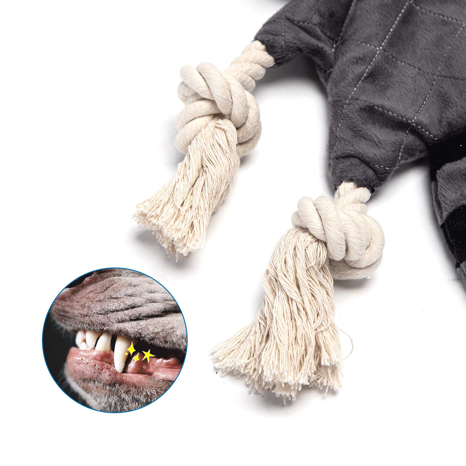 Das Hundespielzeug mit Sound ist ein vielseitiges und unterhaltsames Spielzeug, das speziell für Hunde entwickelt wurde. Mit seinen großzügigen Maßen von 36 x 33 x 9,5 cm bietet es Ihrem Vierbeiner stundenlangen Spielspaß und Beschäftigung. Das Spielzeug besteht aus einem superweichen Plüschgewebe und einem robusten Baumwollseil, wodurch es sowohl zum Kuscheln als auch zum Spielen ideal geeignet ist. Das niedliche Tierdesign besticht durch seine realistische Form und die freundlichen Farben, die die Neugier Ihres Hundes wecken und zum Spielen animieren. Das kurze Plüschmaterial ist besonders weich und angenehm zu berühren, sodass es sich perfekt zum Kuscheln nach einem langen Spieltag eignet. Dank der vollständigen Füllung bleibt das Spielzeug auch bei intensivem Gebrauch in Form und bietet hohen Komfort. Ein besonderes Highlight ist die eingebaute Geräuschvorrichtung, die beim Beißen ein Quietschen erzeugt. Dieses Geräusch sorgt für zusätzliche Anreize und fördert den natürlichen Spieltrieb Ihres Hundes. Es hilft dabei, Angstzustände zu reduzieren und sorgt für Ablenkung in stressigen Situationen. Das robuste Baumwollseil ist ideal für Zerrspiele und unterstützt gleichzeitig die Zahnpflege, indem es beim Kauen sanft das Zahnfleisch massiert und Zahnsteinbildung vorbeugt. Das Seil ist fest mit dem Plüschkörper verbunden und hält auch stärkerem Ziehen stand. Dieses Hundespielzeug vereint Spiel, Spaß und Komfort in einem. Es ist perfekt für gemeinsame Aktivitäten wie Zerr- und Apportierspiele oder auch als Kuschelpartner für ruhige Momente geeignet. Die hochwertigen Materialien und die durchdachte Verarbeitung sorgen für Langlebigkeit und Sicherheit im täglichen Gebrauch. Ob zum Stressabbau, zur Beschäftigung oder einfach als kuscheliger Freund – dieses Hundespielzeug ist ein unverzichtbares Accessoire für jeden Hund. Dank der pflegeleichten Materialien lässt es sich zudem einfach reinigen und bleibt lange hygienisch und frisch. Ein perfekter Begleiter für glückliche und ausgeglichene Hunde!
