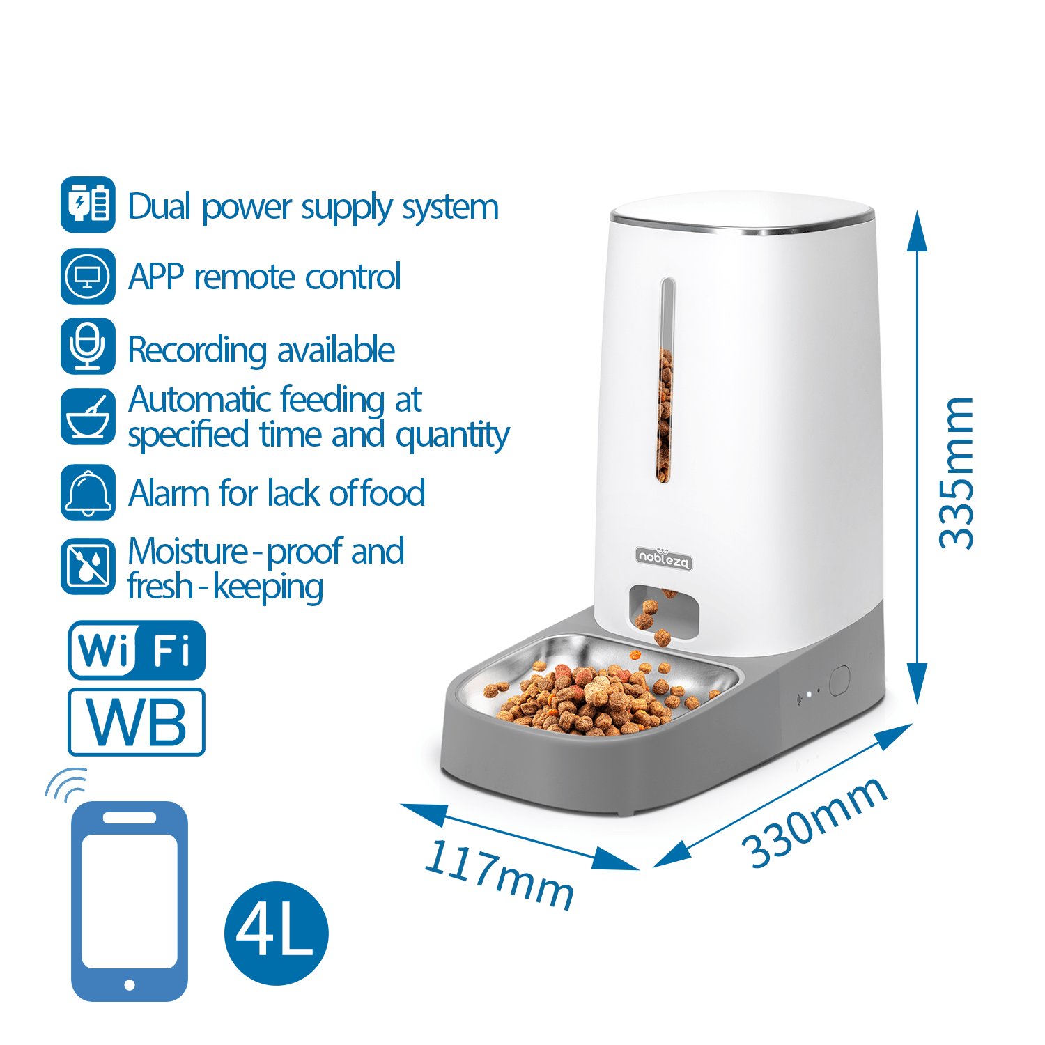 Die nobleza smarte Futterstation mit 4 L Fassungsvermögen sorgt für eine präzise, zuverlässige und hygienische Fütterung deines Haustiers. Per App steuerbar, kannst du Fütterungszeiten und Portionsgrößen individuell festlegen – ideal für Hunde und Katzen. Eine persönliche Sprachnachricht ruft dein Tier zum Fressen, während der feuchtigkeitsdichte Behälter das Futter frisch hält. Der Napf aus rostfreiem Edelstahl ist leicht zu reinigen. Dank Dual-Stromversorgung (Netz & Batterie) bleibt der Betrieb auch bei Stromausfall gesichert. Mit Füllstandsalarm und moderner Technik – perfekt für die tägliche, sorgenfreie Fütterung.