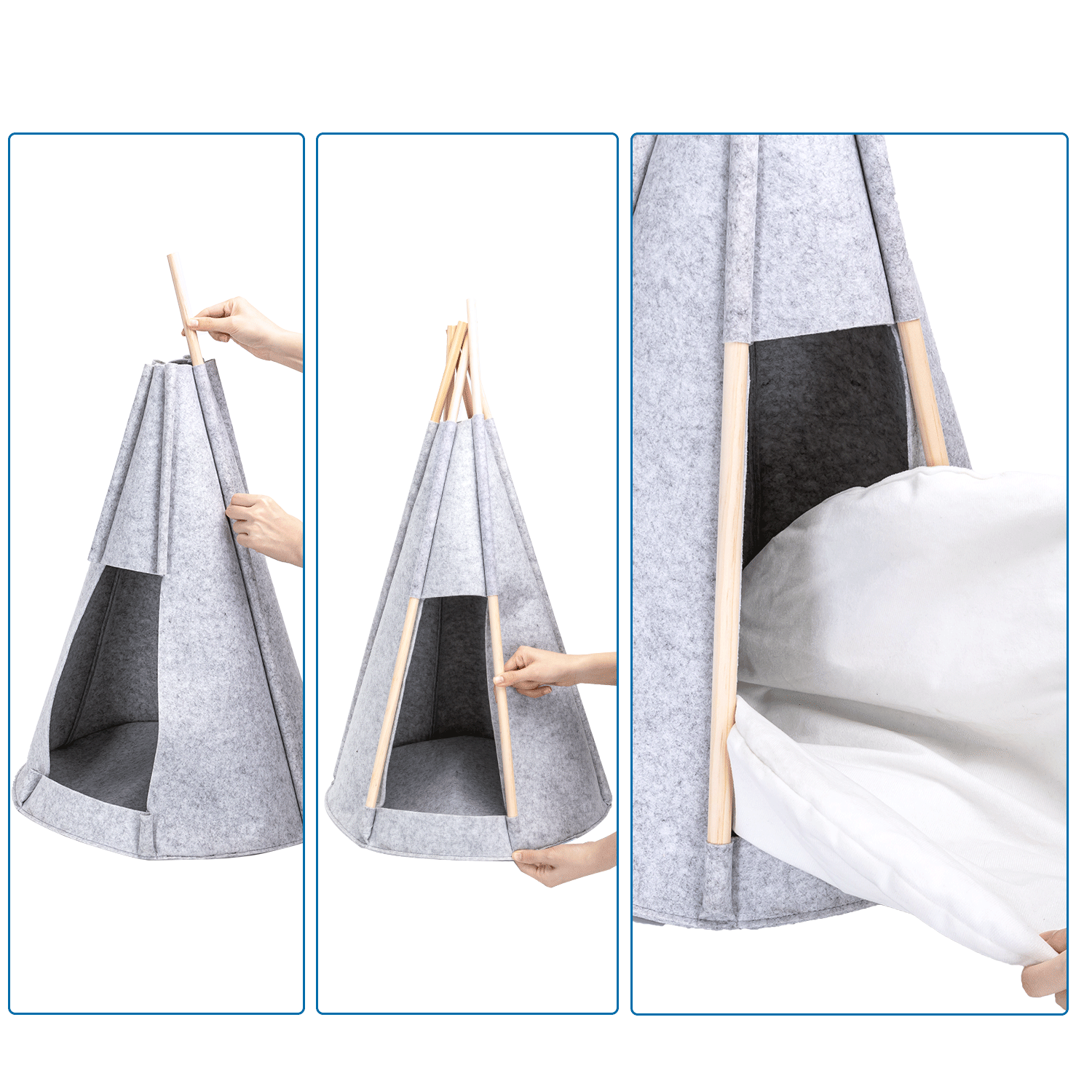 Das hochwertige Katzentipi von Nobleza kombiniert robusten Filz mit einem stabilen Massivholzrahmen für eine langlebige und gemütliche Rückzugsmöglichkeit. Weiße Bommel am Dach setzen dekorative Akzente, während das herausnehmbare Soft-Kissen im Inneren für Komfort sorgt. Formstabil, pflegeleicht und optisch ansprechend – ein eleganter Rückzugsort für stilbewusste Katzenhalter.